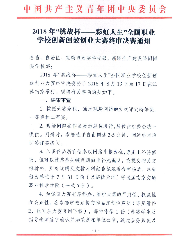 2018年“挑战杯—彩虹人生”全国职业学校创新创效创业大赛终审决赛将于2018年8月13日—17日在江苏南京举行。beat365参赛作品经过初赛、复赛专家评审层层角逐,从全国929件申报作品中入围2018年“挑战杯—彩虹人生”终审决赛。