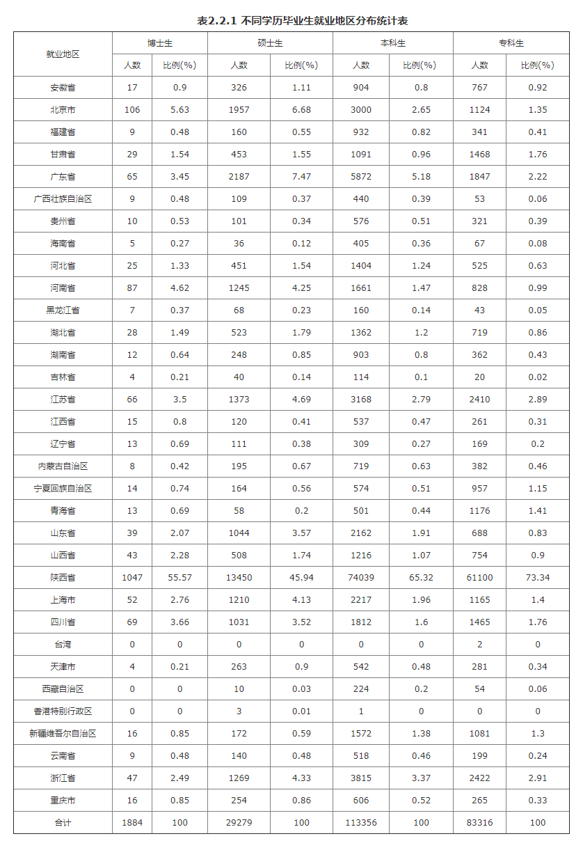 全省不同学历毕业生的就业地区涵盖了我国33个省市自治区、香港特别行政区。陕西省是不同学历毕业生就业地区中最为集中的省份。其中,博士毕业生、硕士毕业生、本科毕业生、专科毕业生在陕西省就业的比例分别为55.57%、45.94%、65.32%、73.34%。除此之外,博士毕业生就业分布较为集中的五个地区分别为北京市(5.63%)、河南省(4.62%)、四川省(3.66%)、江苏省(3.5%)、广东省(3.45%);分布较少的五个地区分布为台湾(0%)、香港特别行政区(0%)、西藏自治区(0%)、天津市(0.21%)、吉林省(0.21%);硕士毕业生就业分布较为集中的五个地区分别为广东省(7.47%)、北京市(6.68%)、江苏省(4.69%)、浙江省(4.33%)、河南省(4.25%);分布较少的五个地区分布为台湾(0%)、香港特别行政区(0.01%)、西藏自治区(0.03%)、海南省(0.12%)、吉林省(0.14%);本科毕业生就业分布较为集中的五个地区分别为广东省(5.18%)、浙江省(3.37%)、江苏省(2.79%)、北京市(2.65%)、上海市(1.96%);分布较少的五个地区分布为台湾(0%)、香港特别行政区(0%)、吉林省(0.1%)、黑龙江省(0.14%)、西藏自治区(0.2%);专科毕业生就业分布较为集中的五个地区分别为浙江省(2.91%)、江苏省(2.89%)、广东省(2.22%)、甘肃省(1.76%)、四川省(1.76%),分布较少的五个地区分布为香港特别行政区(0%)、台湾(0%)、吉林省(0.02%)、黑龙江省(0.05%)、西藏自治区(0.06%)、广西壮族自治区(0.06%)。