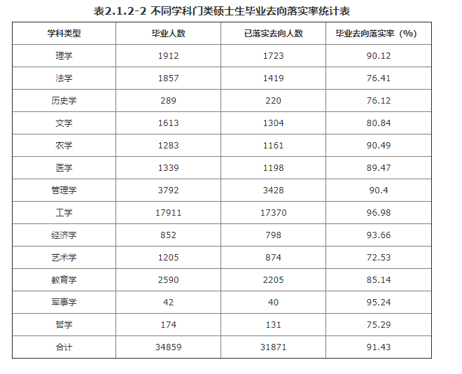 硕士研究生中,毕业去向落实率前三位的学科有工学(96.98%)、军事学(95.24%)、经济学(93.66%),毕业去向落实率后三位的学科是艺术学(72.53%)、哲学(75.29%)、历史学(76.12%)。