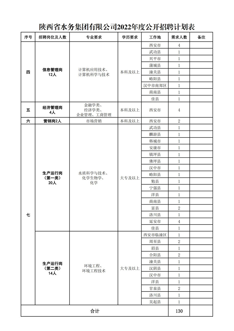 为加快公司人才队伍建设,充实基层一线人员力量,陕西省水务集团有限公司特面向社会公开招聘130名工作人员,现将招聘有关事项公告如下: