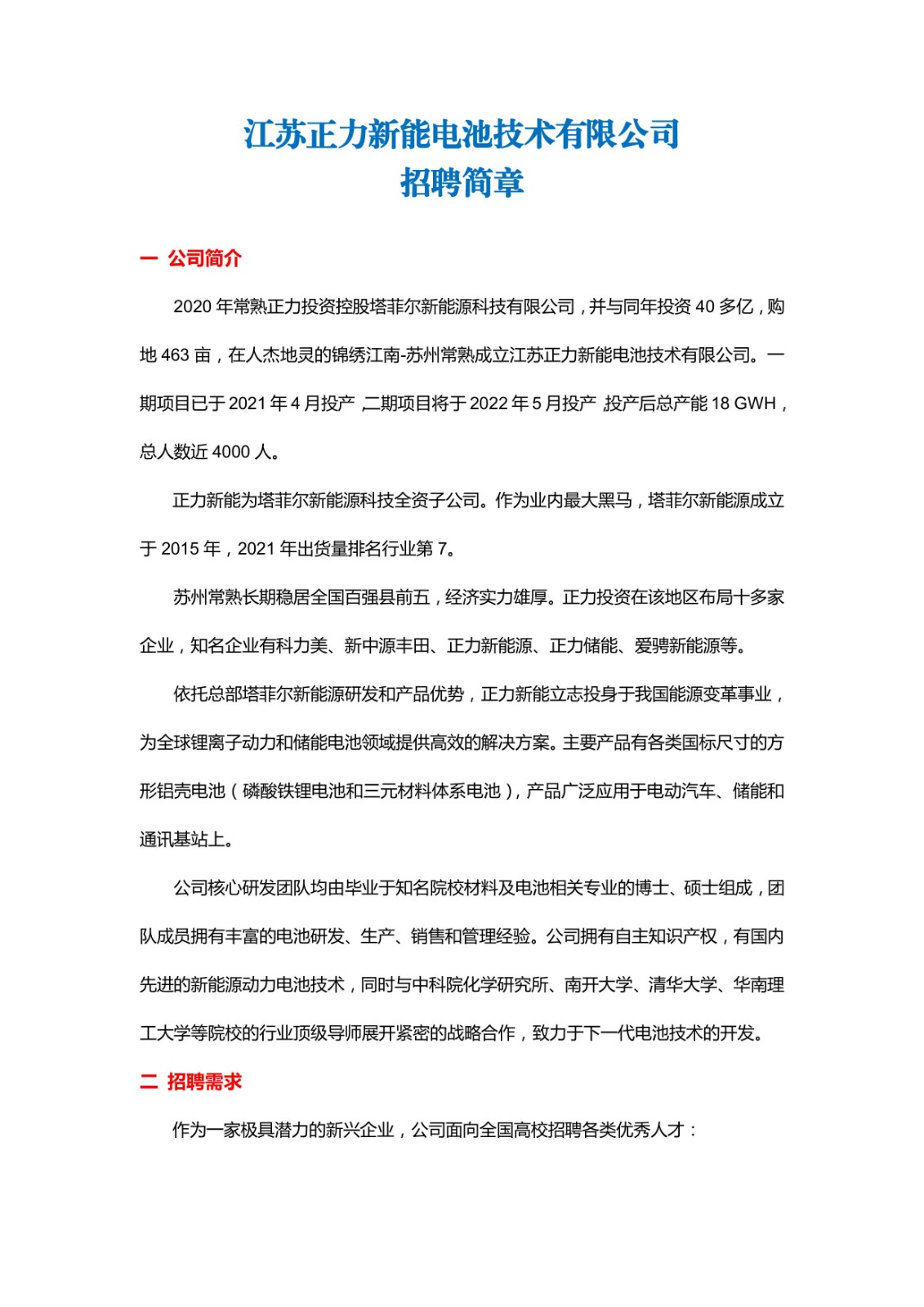 江苏正力新能电池技术有限公司招聘简章